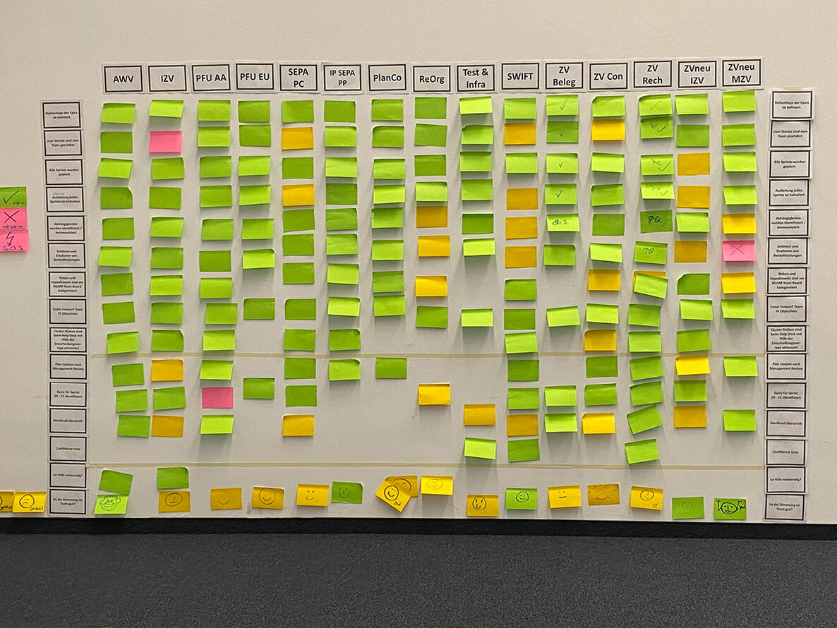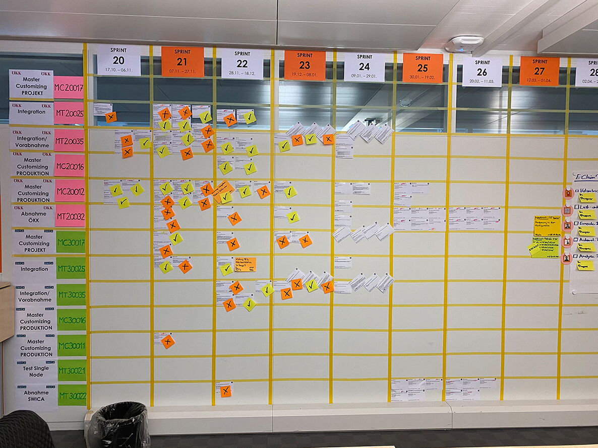 Erfolgreich waren wir an der Transformation von 2 Einheiten mit rund 600 Personen in der Agilen Transformation beteiligt. Dabei haben wir über 40 Scrum Master und Product Owner ausgebildet. Bei weiteren vier Einheiten haben wir über 15 PI-Planning mit bis zu 210 Personen durchgeführt. Das letzte Planning im Mai 2020 war vollumfänglich Remote durchgeführt worden.